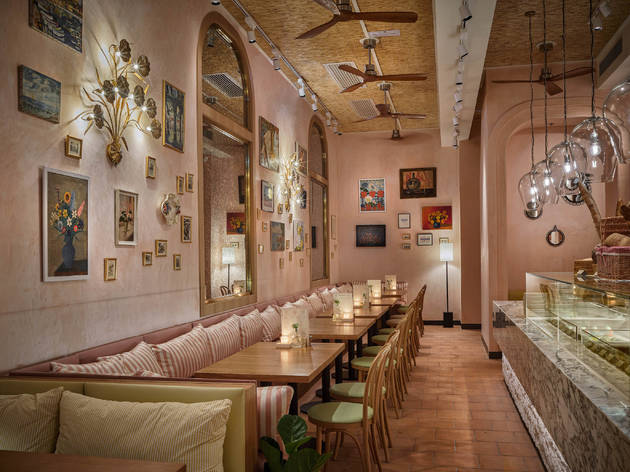 門口位已經係一個好靚的打卡位, 整個建築用粉色同淺黃色做配搭,很有少女心和意大利的海岸風情。店內的裝備設計都是令人嘩然的,復古的吊扇,淡黃色的sofa配返條紋咕𠱸,牆上的每一幅油畫,陽光打進餐廳的光線,再望住蔚藍的海邊,餐廳每一個位置都是打卡位!