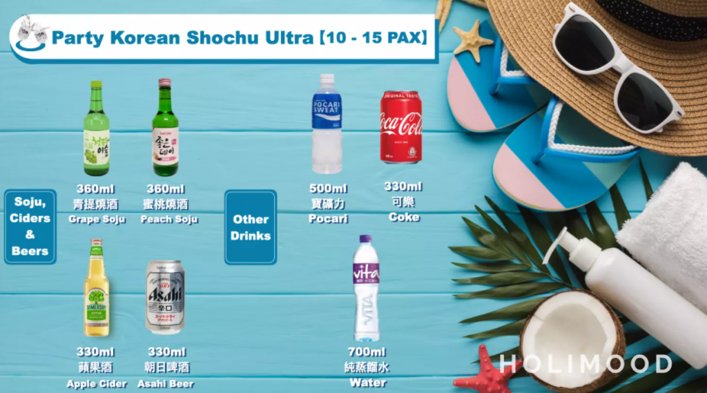 飲品種類多元化,設有多個不同的套餐組合給你選擇,包括汽水果汁套裝、韓式燒酒汽水套裝、雙重啤酒汽水套裝、烈酒派對套裝和香檳盡飲派對套裝,總有一款適合你們。而且有專人將飲品送到你手上,夠方便!