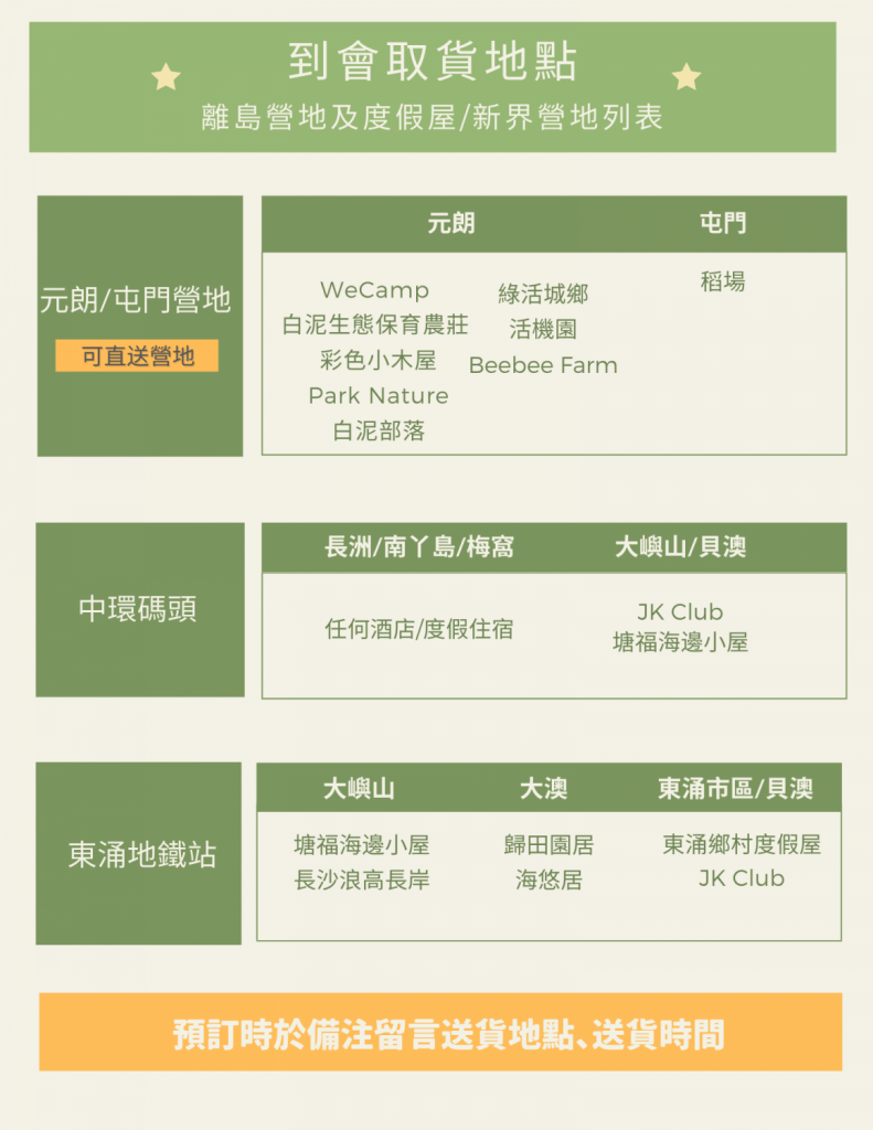 入住離島營地或度假屋的客人: 供應商會送貨至中環碼頭或東涌地鐵站。請根據交通地點選擇於中環碼頭或東涌取貨。