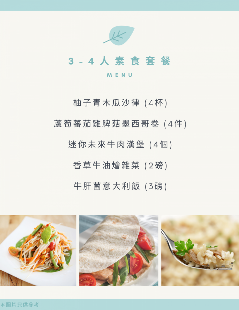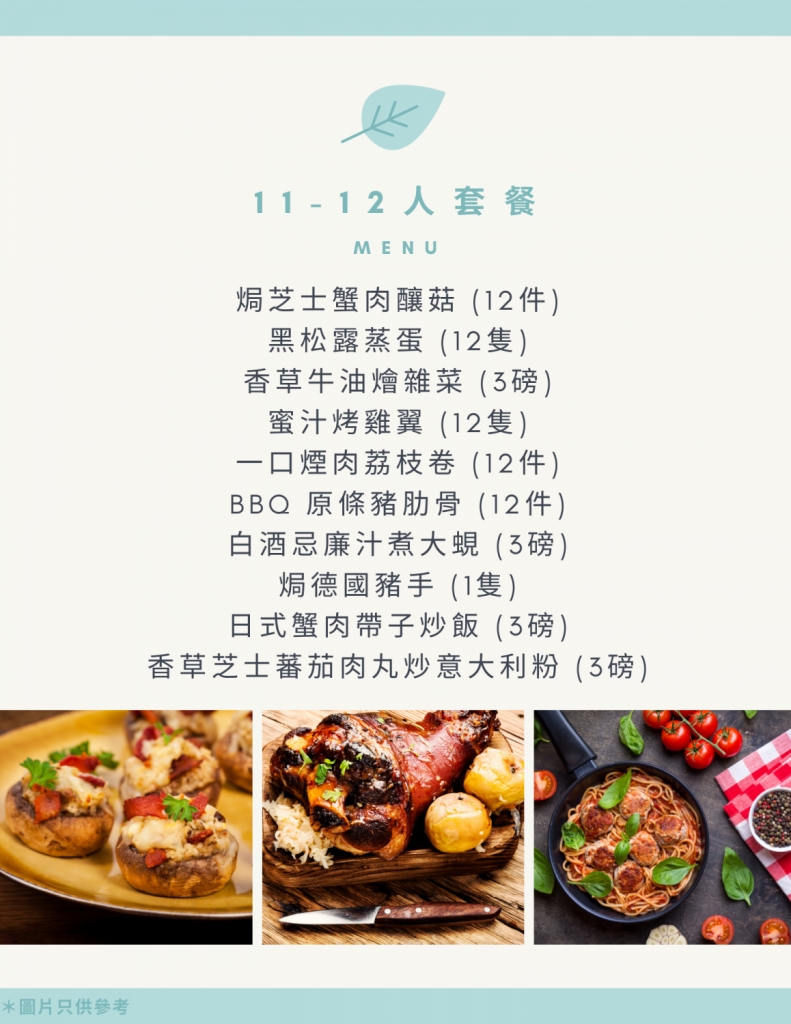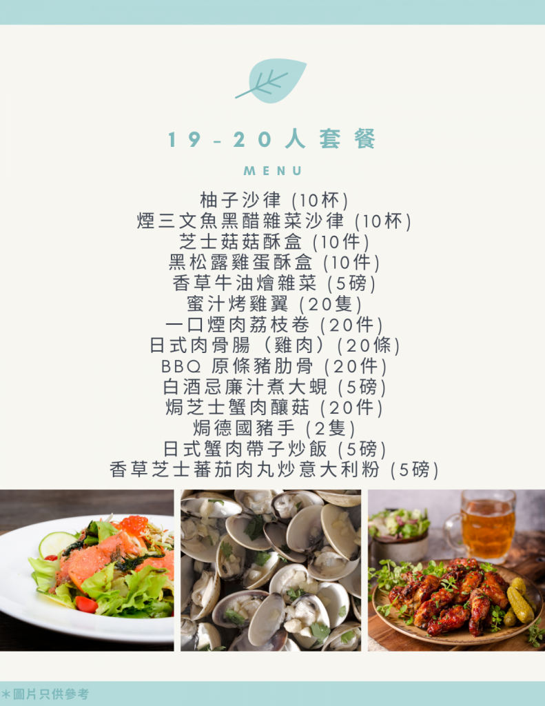 套餐份量少至3人,多至20人,無論是小型聚會,還是大型派對都非常適合,而且套餐還有照顧素食者的需要~