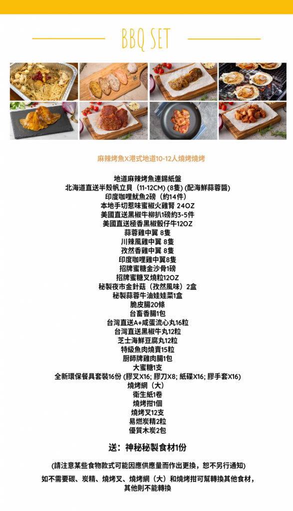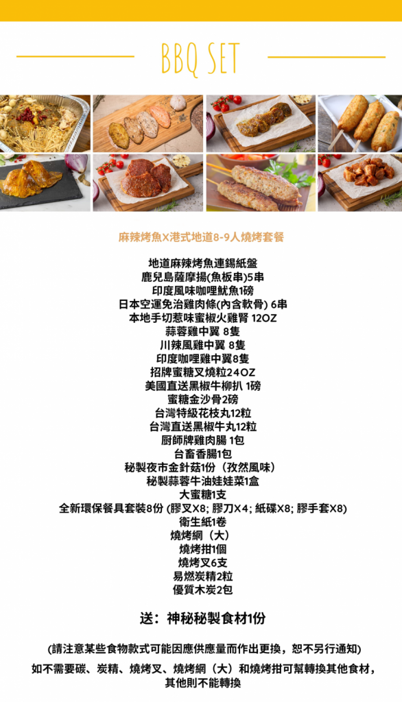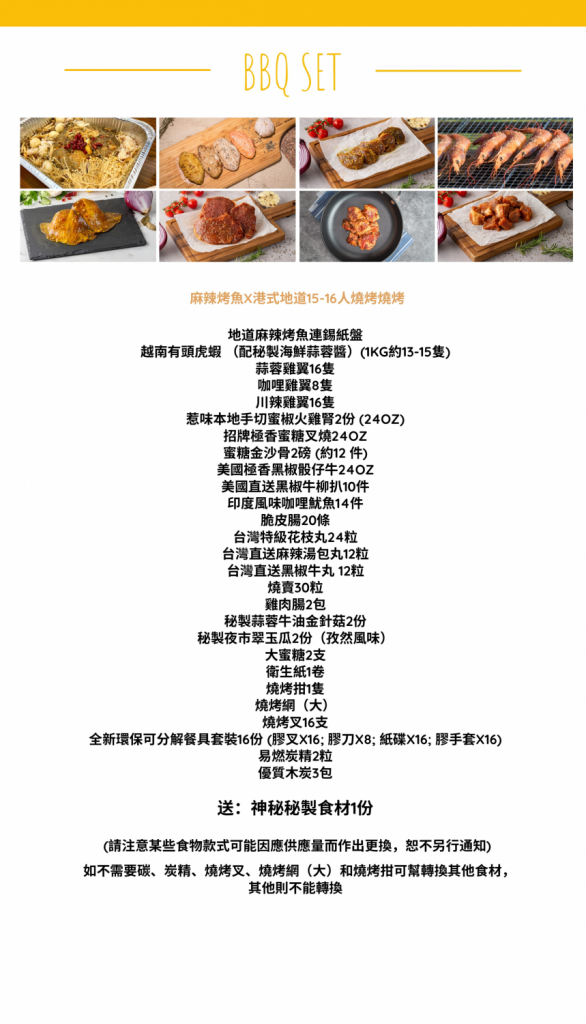 套餐提供最少6-8人、最多28-30人的份量,食物種類幾乎多達一人一款,有烤雞翼、燒雞扒、燴牛肉等等,選擇多元化,不怕沒有選擇,還要啱晒不同人的口味!