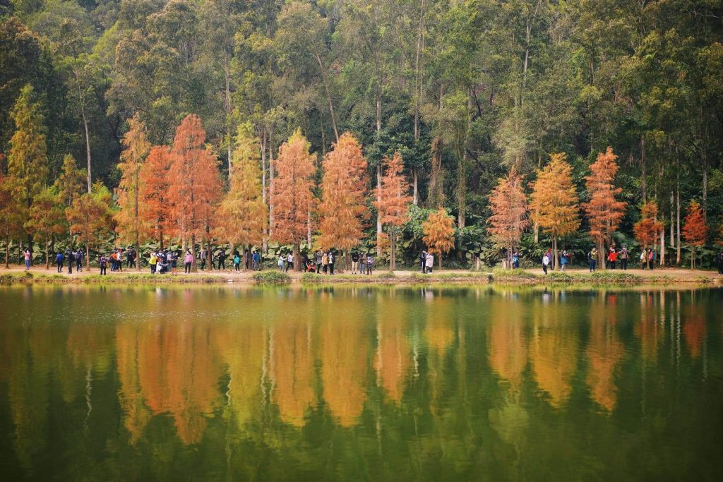 水塘湖面平靜如鏡面。在秋冬去時,流水響水塘會中映照出落羽松紅葉及白千層的樹林倒影,景觀十分優美,猶如一面「天空之鏡」,因此成為香港熱門打卡景點及賞紅葉景點之一。