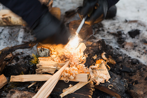 首先把粗木柴擺放成三角形的陣形,然後找一些燃料,例如樹葉、枯樹枝等比較容易燒著燃料,然後把它疊在一起放置在三角形的中央,之後再將樹枝架起錐體,將中央留有空氣流通的位置。點燃中央的燃料,直至火勢維持,再按火勢補充木柴。