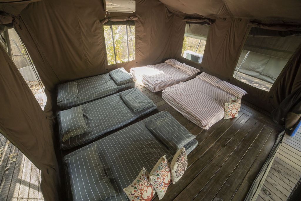 南非營屋內配備豪華睡墊、寢具、木製的地板、燈、傢俬、冷氣設備。寢具,枕頭,被鋪都已經包曬!
