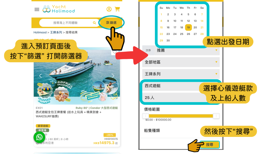 - 按下”篩選” 可打開篩選器,這裡會根據你的出發日期/上船人數等條件,篩選出可預訂之船隻