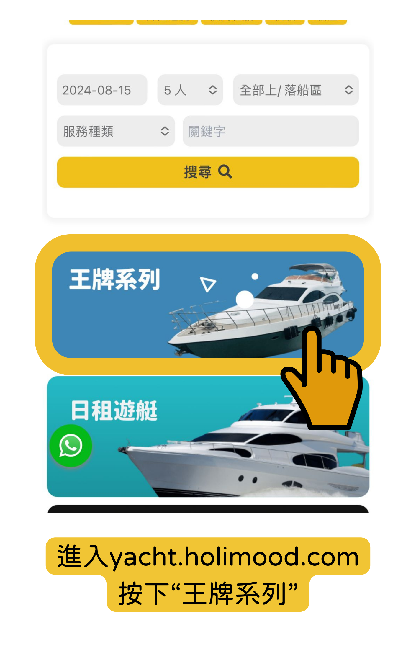 - 在 Yacht Holimood 首頁先點進日租遊艇/「王牌系列」頁面。