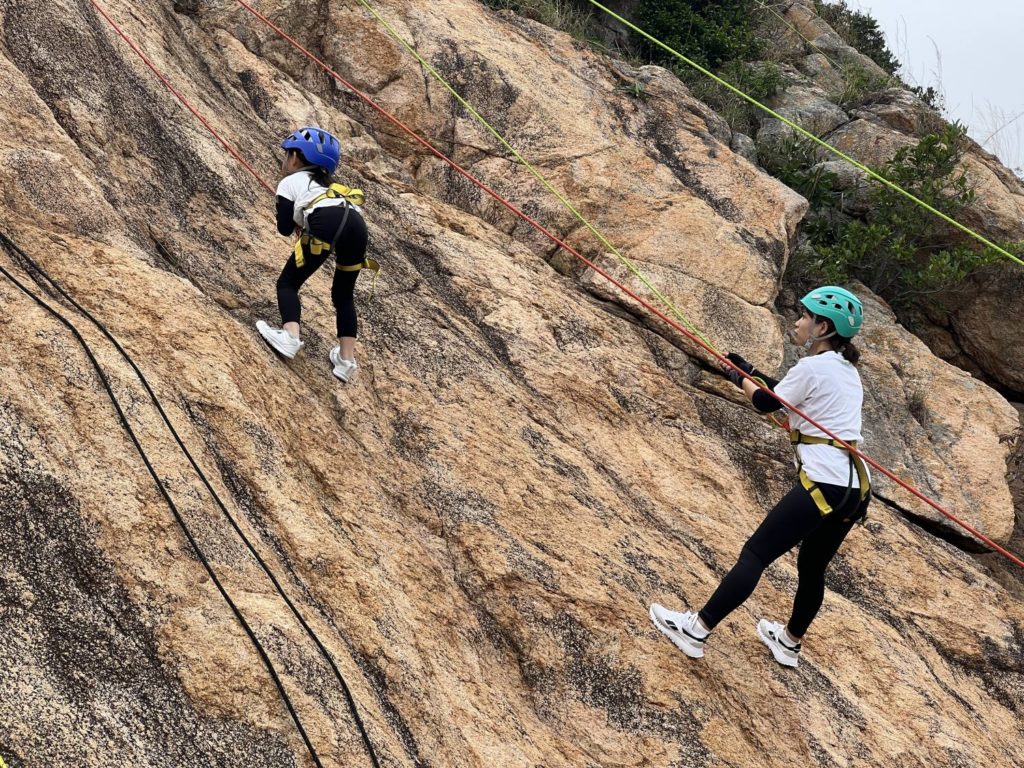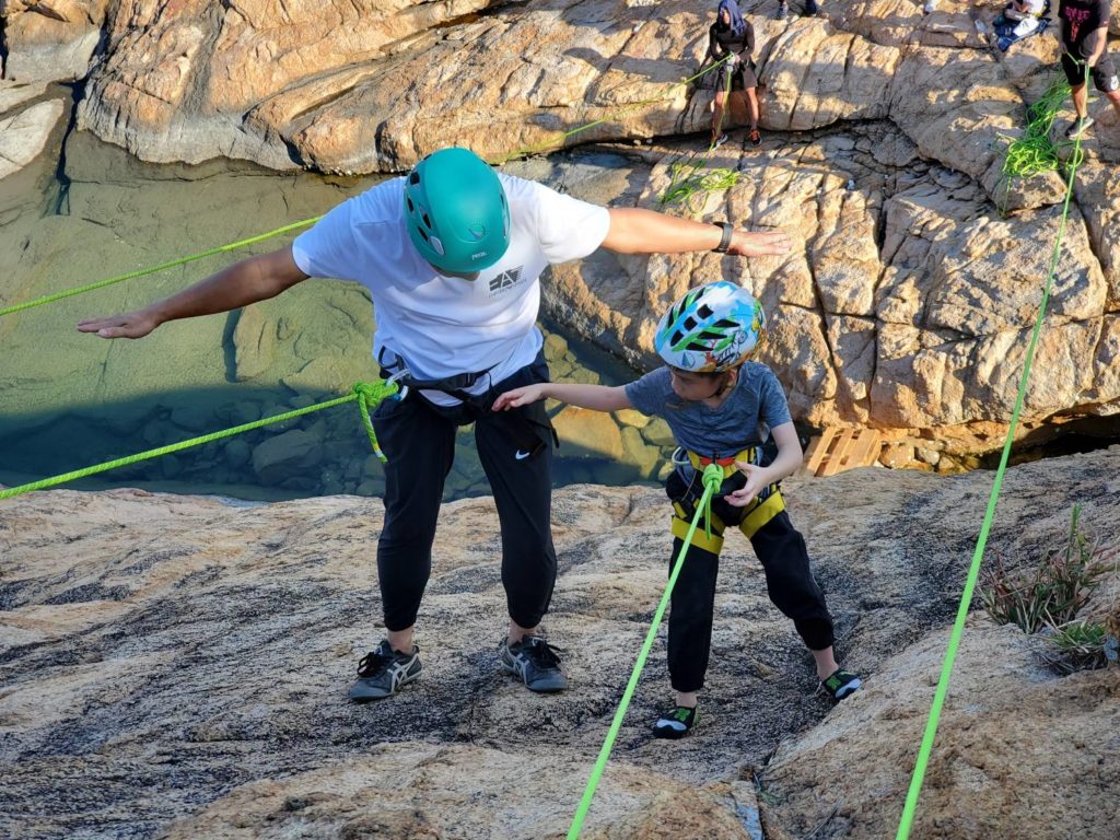 小編跳出去既時候都猶豫左好耐,所以如果成功既小朋友真係好叻叻啊!飛出去既時候可以欣賞到兩崖之間既海天山色,個景色靚到已經唔記得左自己懸掛係半空~ 而且教練會小班教學,清楚講解沿繩下降及攀岩既技巧,只要遵從教練既指導就非常安全好玩啦~