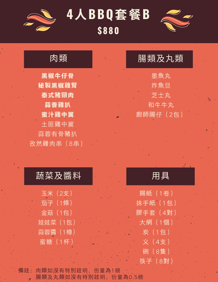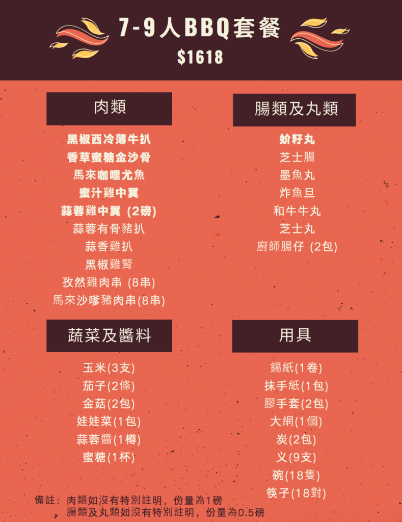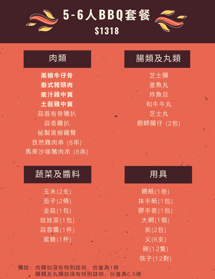 每個套餐的食物款式選擇都很多,雞中翼、豬扒、雞扒、丸這些基本食物一定有,還有牛仔骨、豬頸肉、串燒!而且每個套餐都包括醬料讓你另外再調味,滿足喜歡重口味的你!
