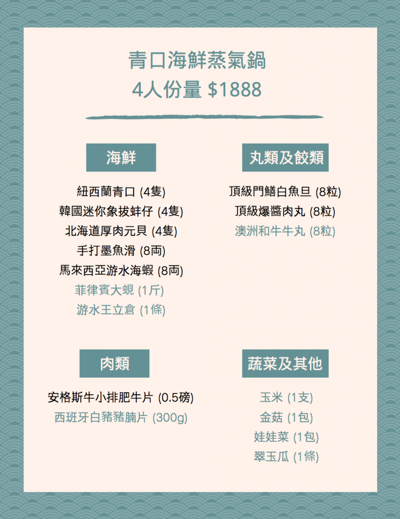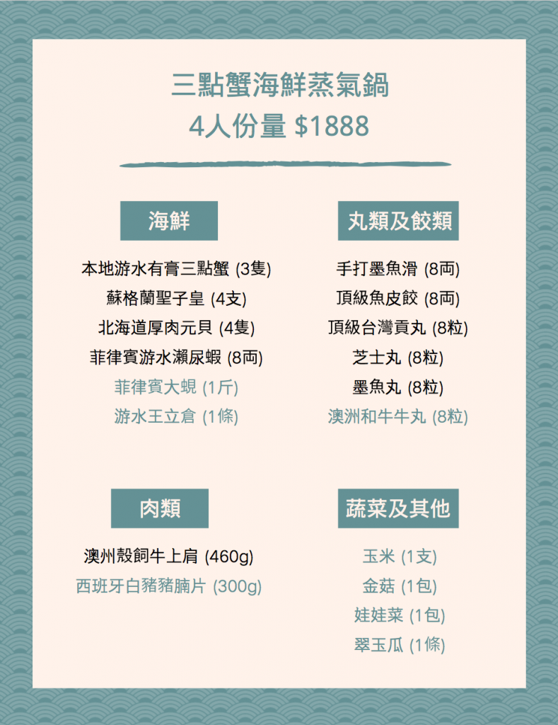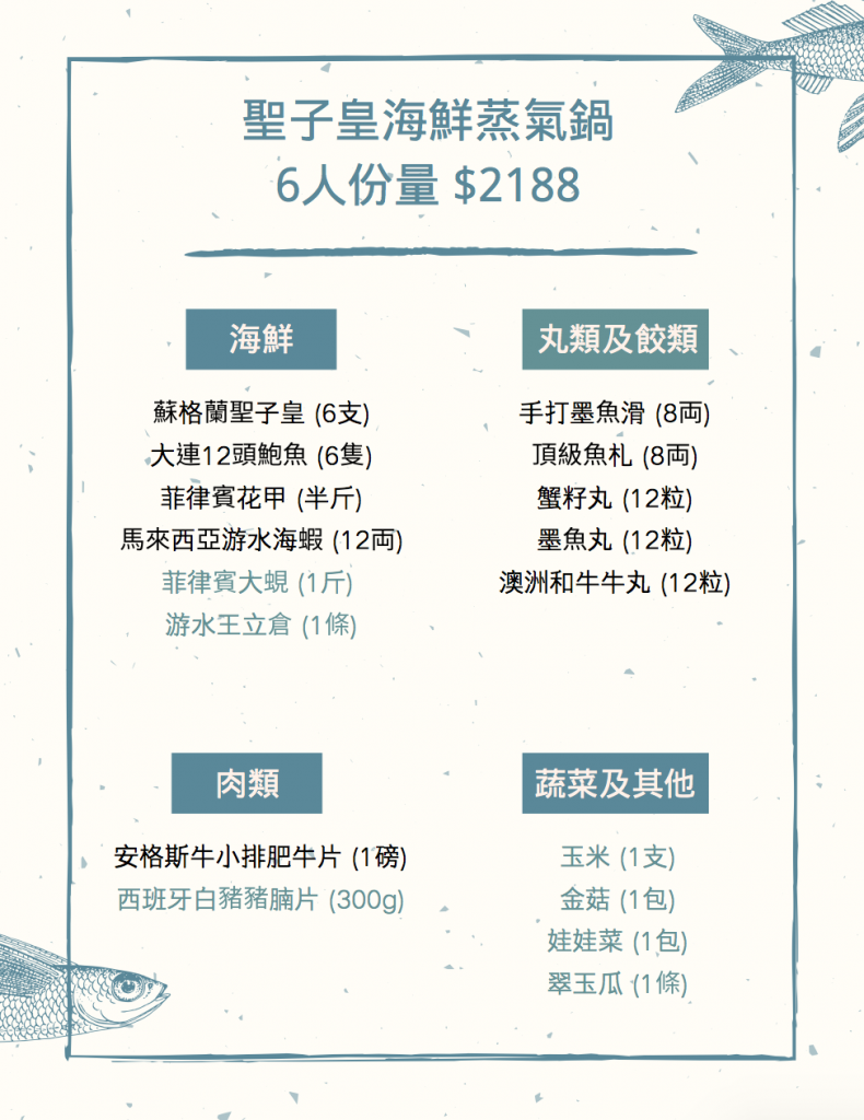 海鮮蒸氣鍋有4人或6人的份量選擇,有花甲海鮮蒸氣鍋 、聖子皇海鮮蒸氣鍋、海花螺海鮮蒸氣鍋、青口海鮮蒸氣鍋等多款選擇,套餐有元貝、海蝦、大蜆、王立倉等新鮮海鮮,亦附丸類、肉類及蔬菜。
