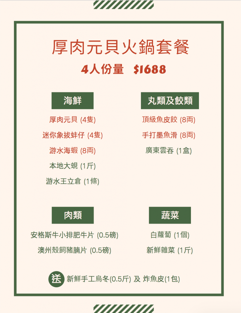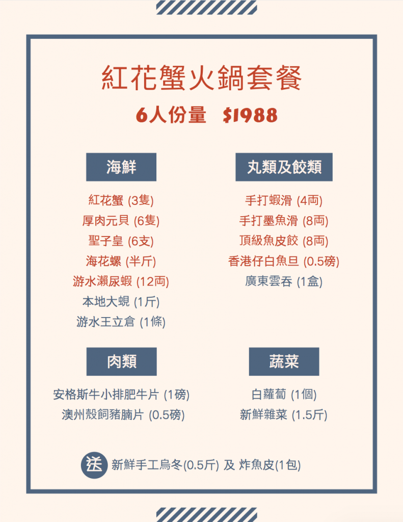 4人或6人的火鍋份量也可以提供,海鮮豐富多款、份量充足,有厚肉元貝、貴妃蚌、無沙花甲、紅花蟹等套餐選擇,總有一款啱你口味!將海鮮和肉片在沸騰的熱湯裡涮一涮,一定是鮮甜又美味,讓人回味無窮!