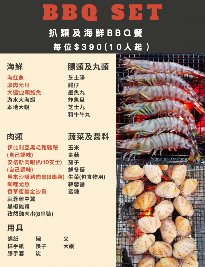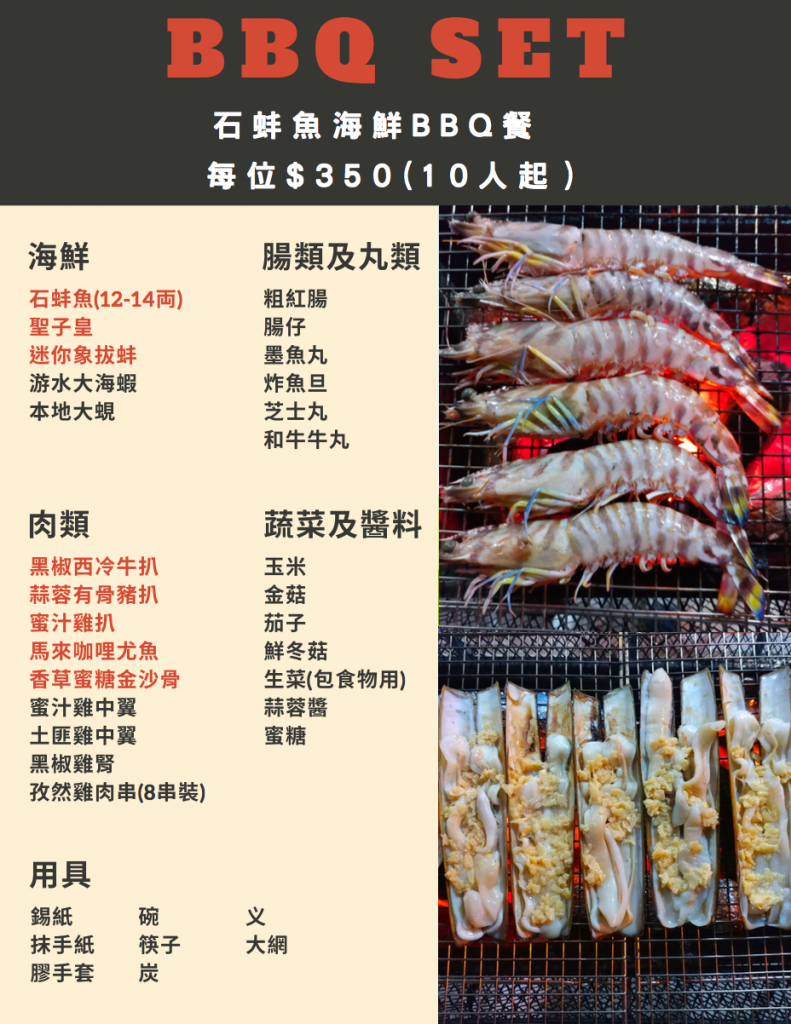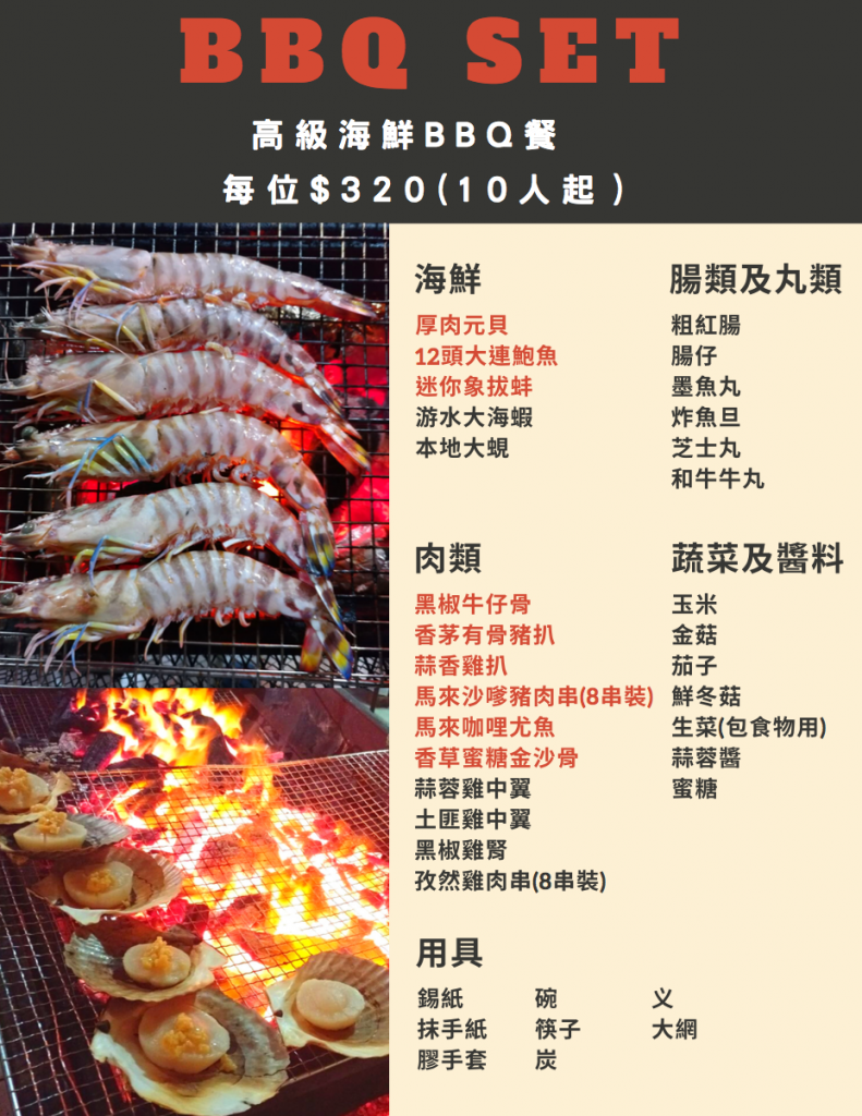 如果喜歡海鮮的你,就不能錯過海鮮BBQ餐,不過海鮮套餐是10人起計,份量和款式更多,有厚肉元貝、鮑魚、本地大蜆、迷你象拔蚌等選擇。全部海鮮都新鮮肥美,燒過後味道更濃郁,多人聚會選擇這個就最適合啦!