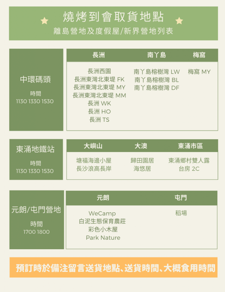 訂購到會時記得在備注留言所入住的營地的全名、送貨時間、大概食用時間。