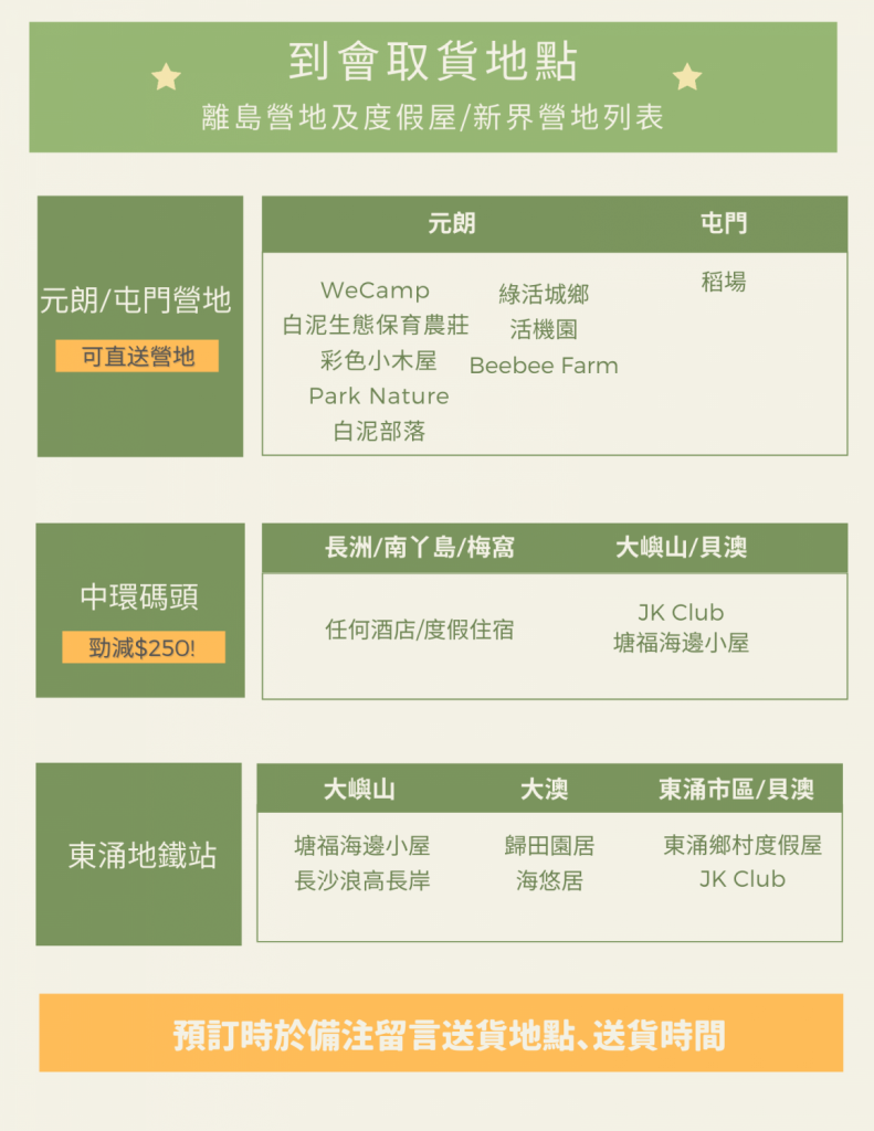 入住離島營地或度假屋的客人: 供應商會送貨至中環碼頭或東涌地鐵站。請根據交通地點選擇於中環碼頭或東涌取貨。