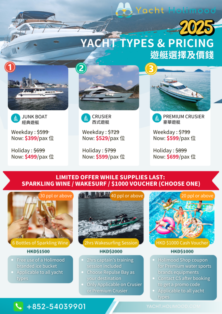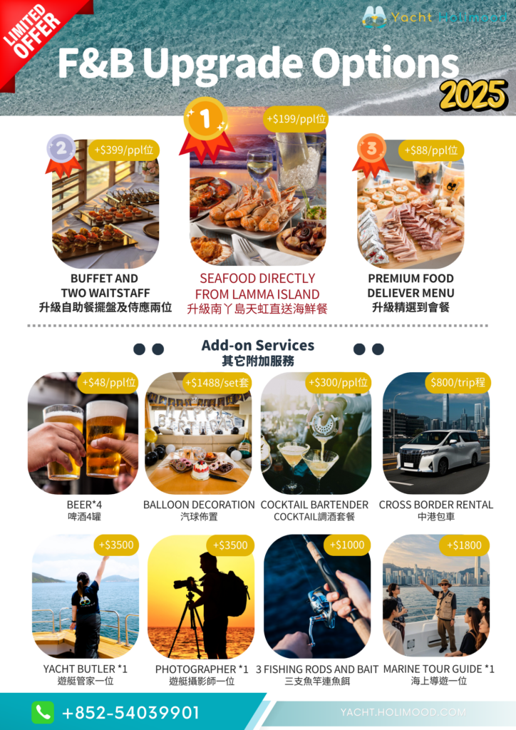 Holimood presents the “Hero Series” All-Inclusive Boat Party Package, which includes lunch, drinks, and water toys — all charged per person! Guests can also flexibly choose their pick-up and drop-off points as well as their destination. It’s super convenient — you can board from Central, Tsim Sha Tsui, and more! You can even upgrade with premium food and wine packages, balloon decorations, or an upgrade chef experience — all fully customizable! Yacht prices are divided into 3 categories: Luxury Western Yachts, Western Yachts, Classic Yachts. (Keep reading to discover our limited-time offers!)