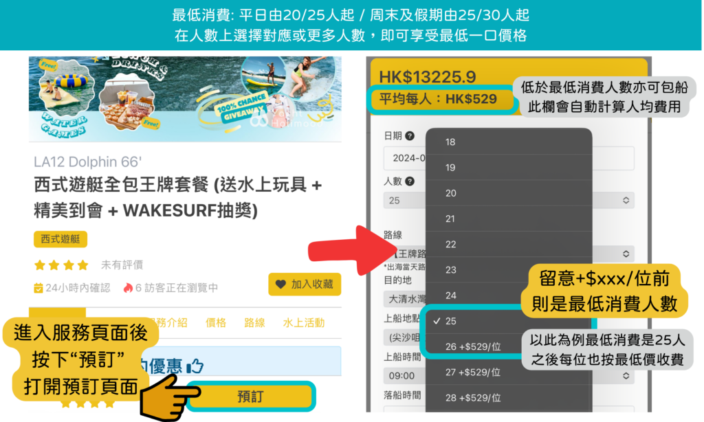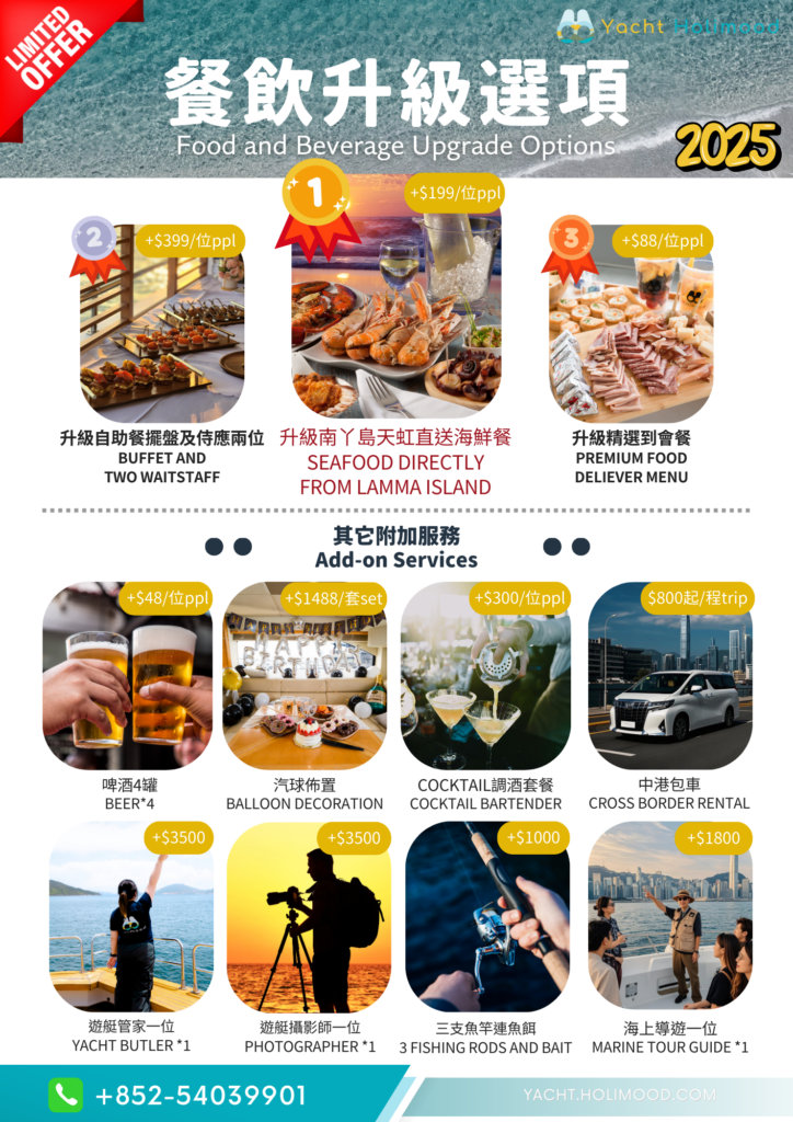| 人均費用 | 經典遊艇 ~$600-800 西式遊艇 ~$800-$1000 豪華遊艇 ~$1000-$1500 | 平日 $599 假期$699 平日 $729 假期$799 平日 $799 假期$899 |