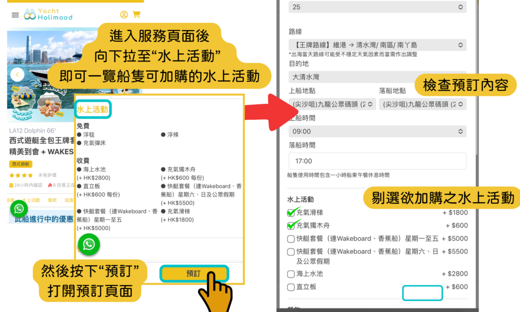 - 你便可以在此頁檢查預訂內容,剔選欲加購之水上活動,進入預訂及付款流程。