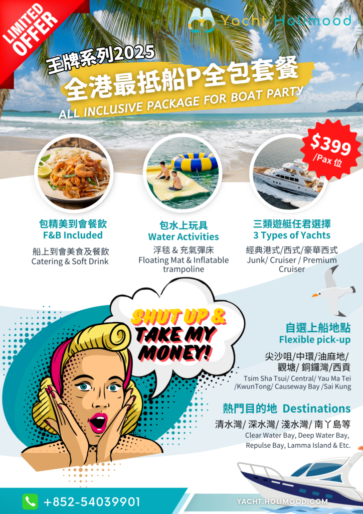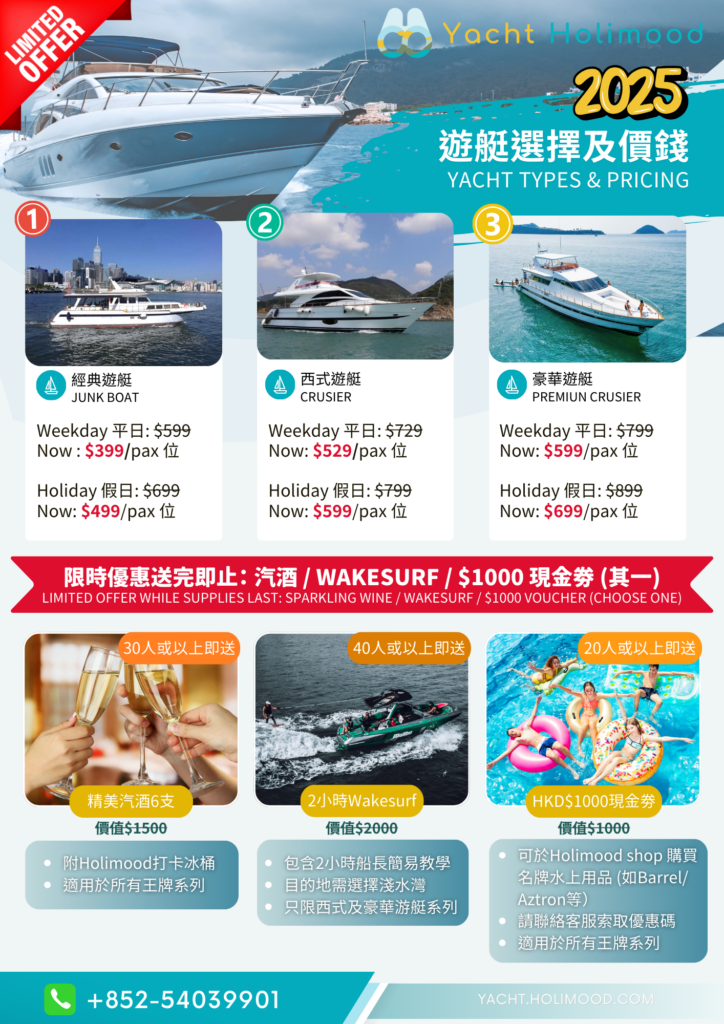 Holimood 推出「王牌系列」全包船P套餐已包含午餐、飲品同水上玩具。而且按人頭收費,而且客人可以靈活自選上落船地點及目的地!方便到可以喺中環、尖沙咀等等地方上船!仲可以自選升級多款餐酒套餐、連生日主題佈置等都可以幫你安排、。遊艇價錢分3個類別:豪華西式遊艇,西式遊艇同經典遊艇。(繼續閱讀了解限時優惠)