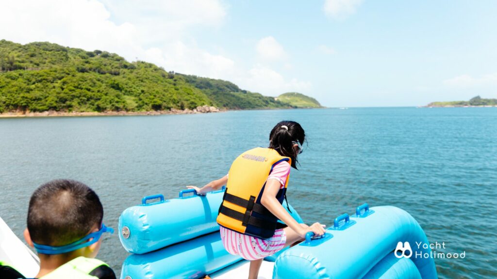 這三樣被稱為船P「基本款」。特別是『充氣滑梯』,從飛橋直衝入海,是每個鐘意玩水的朋友必須打卡的環節 。其實揀船時要留意,如果有小朋友,選擇大型豪華遊艇如 SL05 Pearl Moon 或 LA01 Elephant 空間闊落,提供的彈床與浮毯設施更穩定。