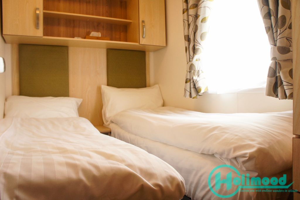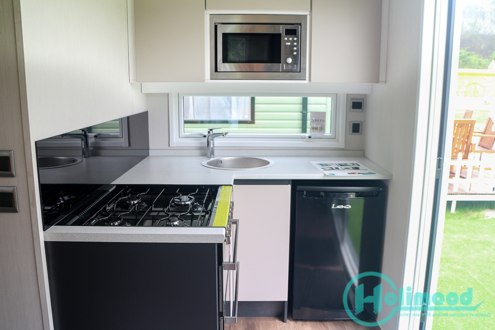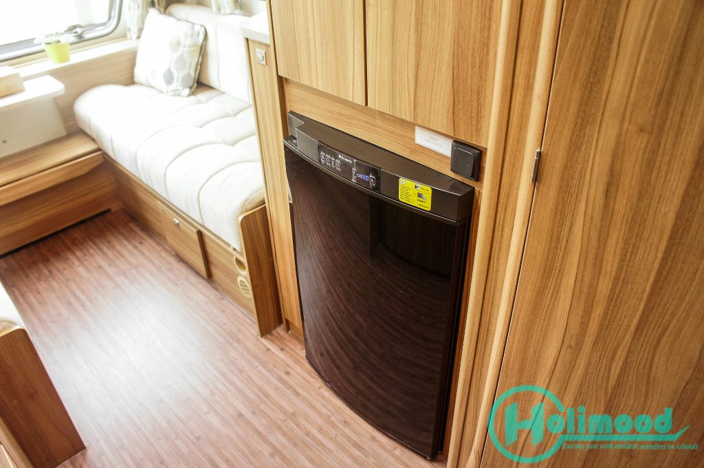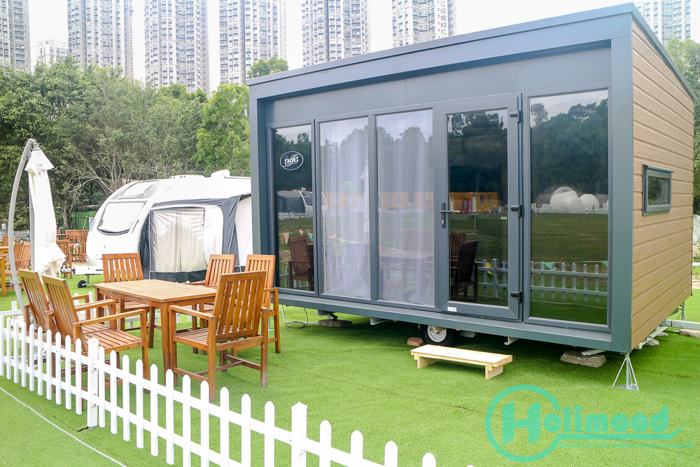 這個車箱設計時尚,是2014年最新的車款,有一面落地玻璃,防似與營地內的自然環境完全相融。車內環境也佈置時尚,而一般露營車有的設備,它都不缺!
