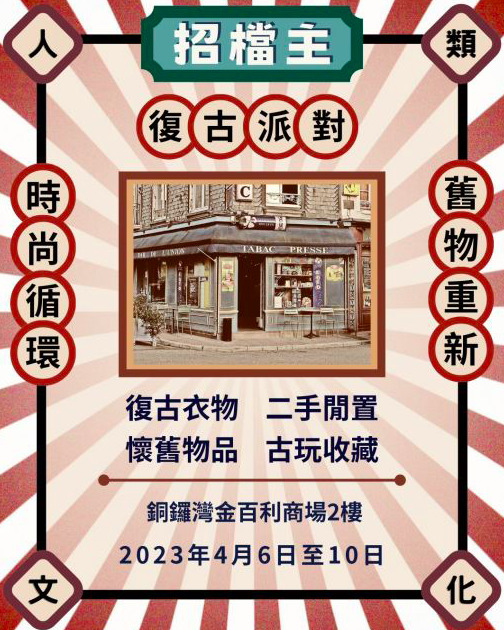 銅鑼灣金百利將在復活節期間舉行一個vintage市集派對,是時代的碰撞交織,是過去也是現在,是舊也是新!對復古、中古、Y2K風格衣物飾品、一手產品、二手閒置、喜愛收藏、正版二手書、vintage風格雜貨和家具、黑膠唱片、菲林相機、工藝品、銀器、手繪等等有興趣的你,是個不可錯過的機會,不妨在復活節假期間抽時間來到市集,一齊沉醉於時代交織帶來的多巴胺!大會更鼓勵所有出席人士穿着Vintage風格衣服,在逛市集的同時也可以享受另類的cosplay趣味。