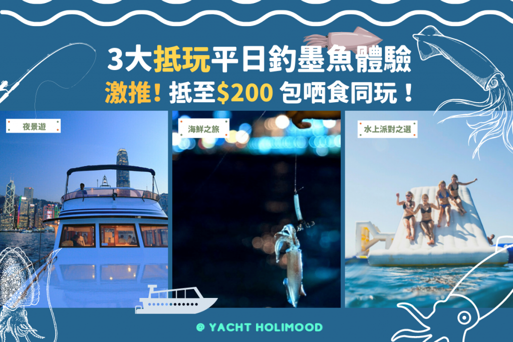 钓墨鱼季节又到了! Yacht Holimood 为你一系列精选3大钓墨鱼团,平日玩更抵至$200一位,任你玩任你钓 。 一于趁平曰人少位多,约埋朋友或一家大细一同享受墨鱼的好时机,顺带在船上吹吹海风,真正感受出海的休闲及宁静时光~
