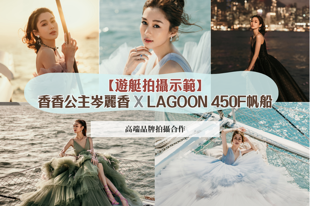 這次拍攝的主角,是深受大眾喜愛的「香香公主」岑麗香 (Eliza Sam)。為了展現其設計晚裝的飄逸與高貴,客戶選擇了我們的旗艦船型之一 —— 頂級雙體帆船 Lagoon 450F。