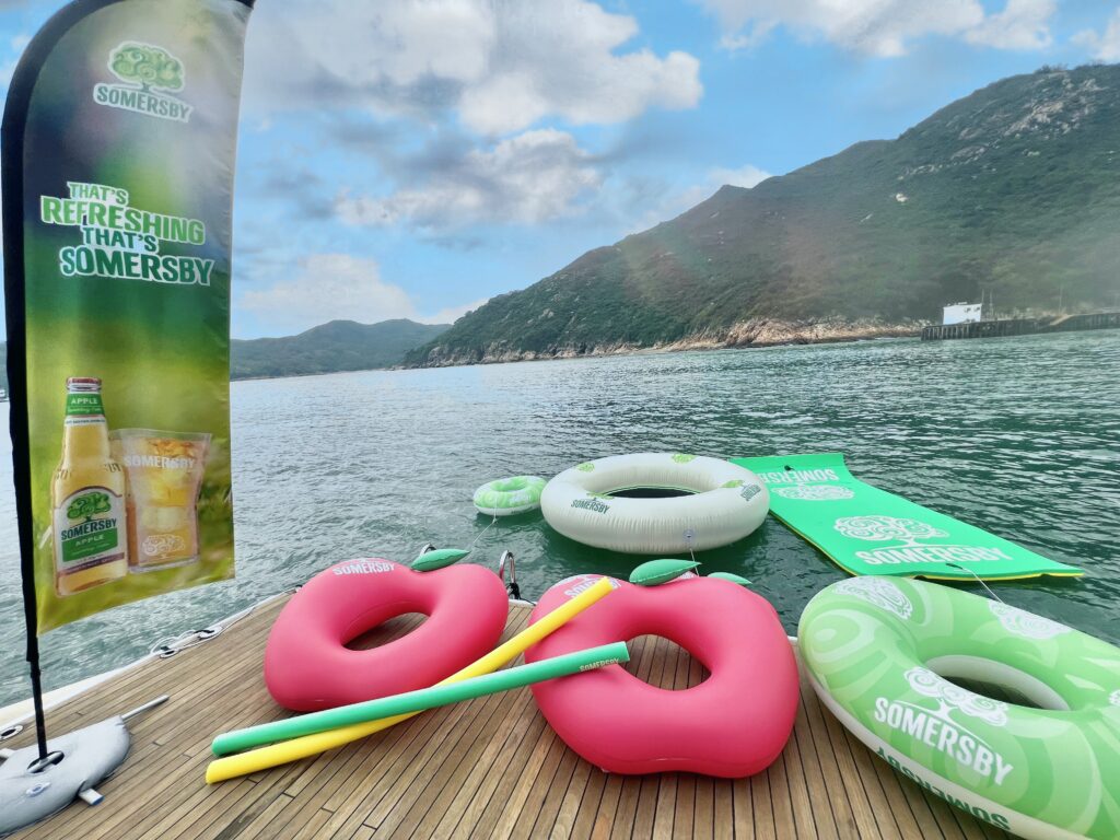 • 深度品牌化: 遊艇的每個角落都經過精心佈置,從印有 Somersby 標誌的訂製靠枕,到色彩鮮豔、充滿夏日氣息的品牌水上玩具(如浮床、水泡),讓整艘遊艇搖身一變,成為專屬於 Somersby 的海上場地。