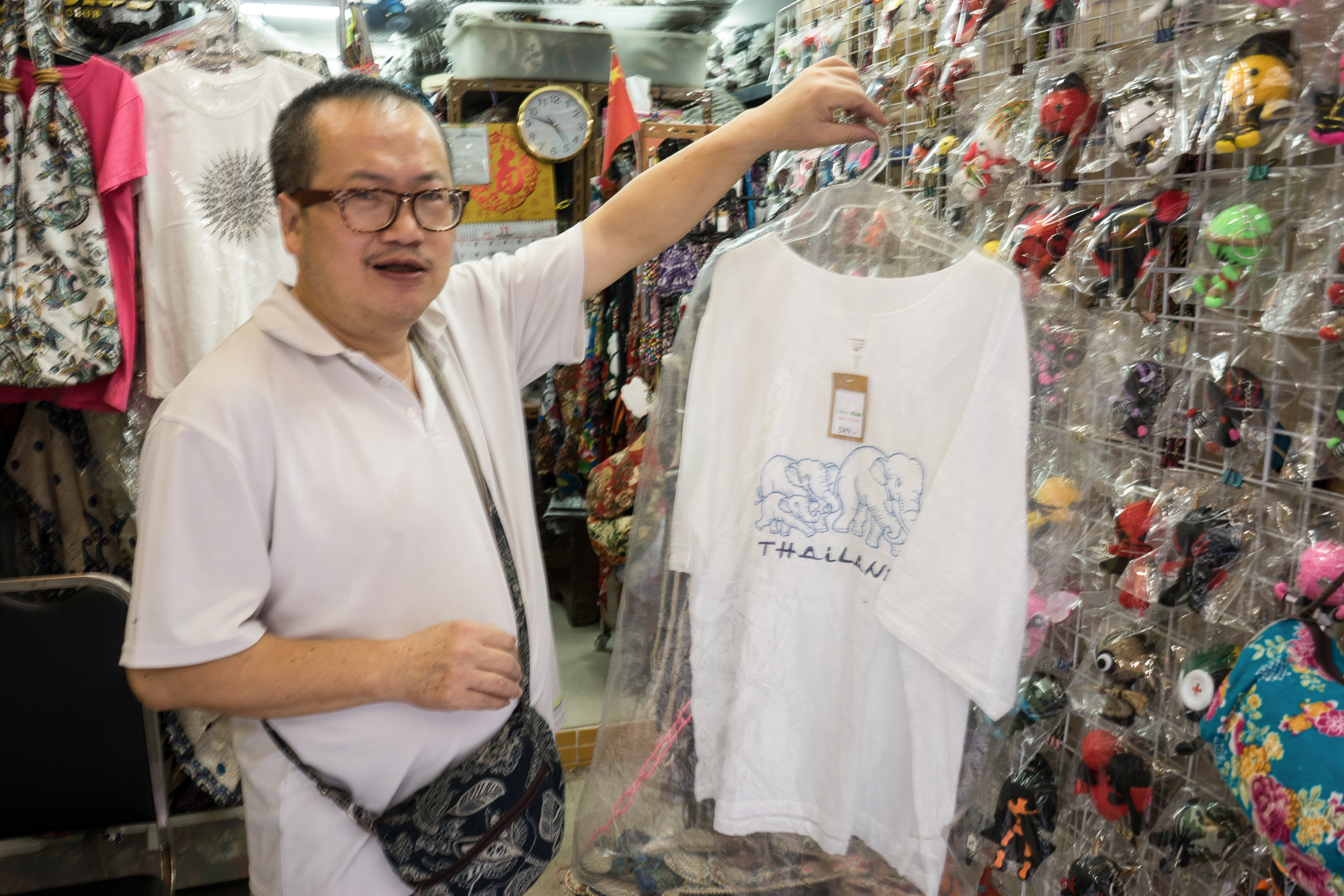除左襯手繩,肥老闆襯衫都頗有心德。而佢手持嘅呢件就係泰國入口嘅純綿T-shirt, 老闆叫我摸摸衣料,果然一如佢所講很柔,很白,很舒服。